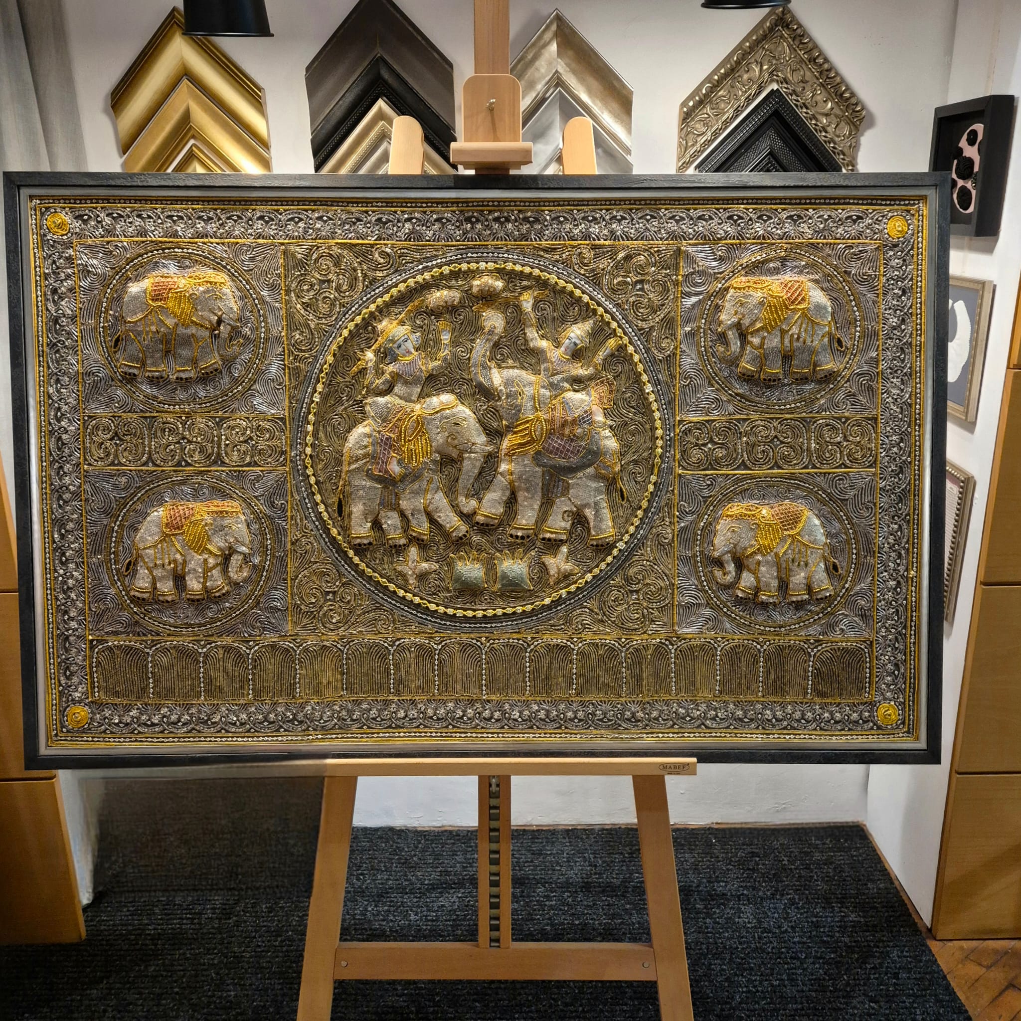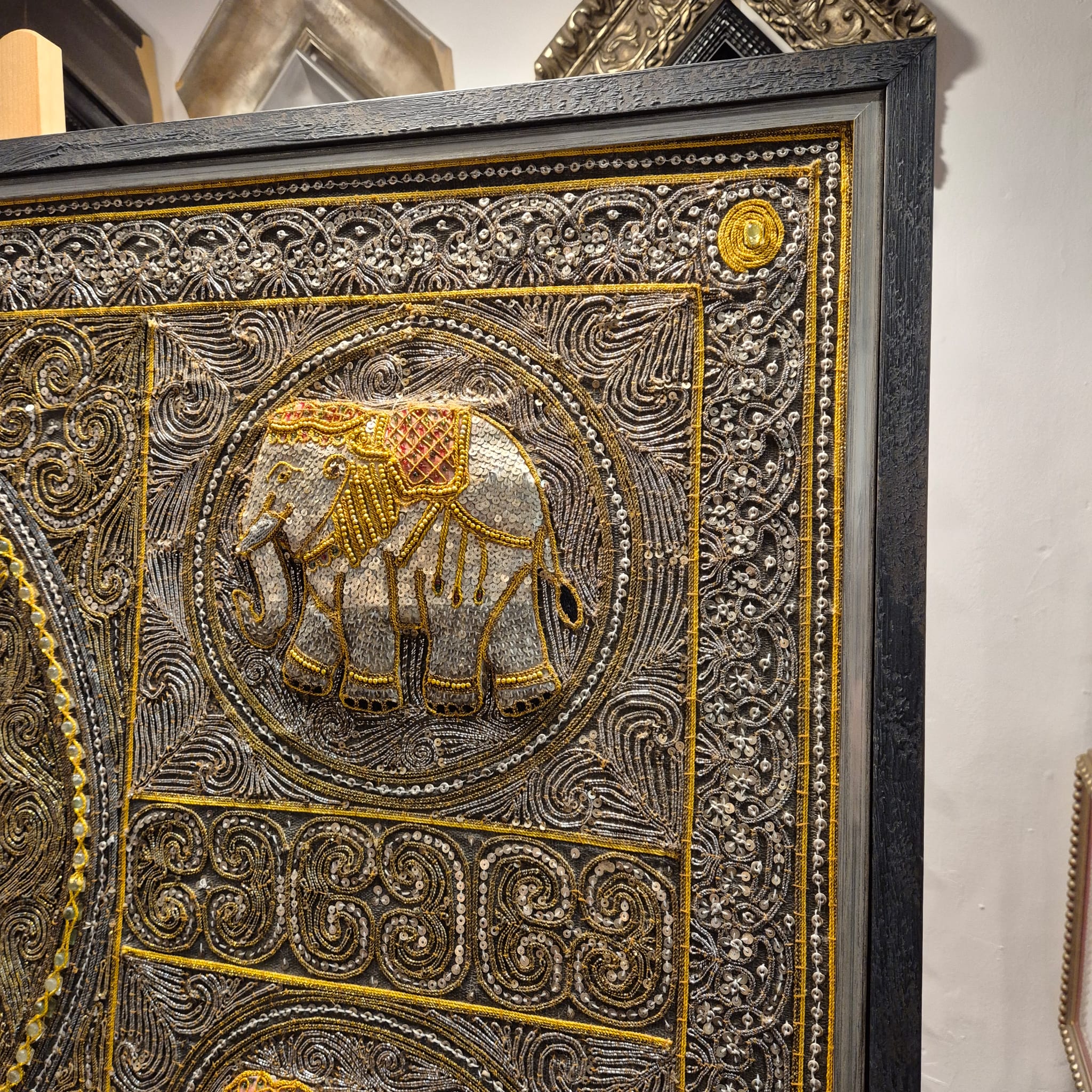 Us presentem el quadre emmarcat amb un tapis tèxtil anomenat Kalaga de Tailàndia. Heu de saber que aquesta és una labor que es ven en tot el Sud Est Asiàtic com a una peça per penjar a la paret.