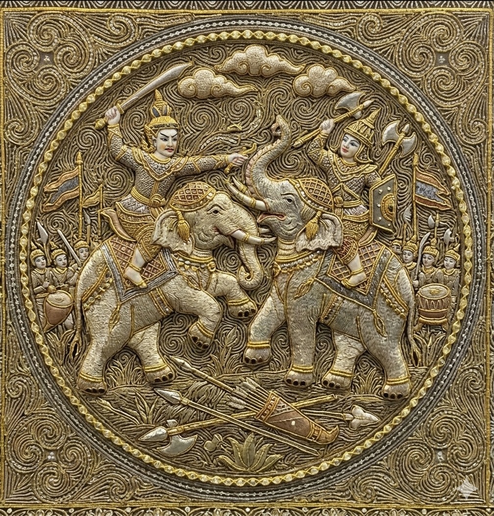 Aquest tapis representa la “Guerra dels Elefants” que suposadament va passar l’any 1593. Els protagonistes foren el rei Naresuan de Tailàndia i el príncep de Birmània.