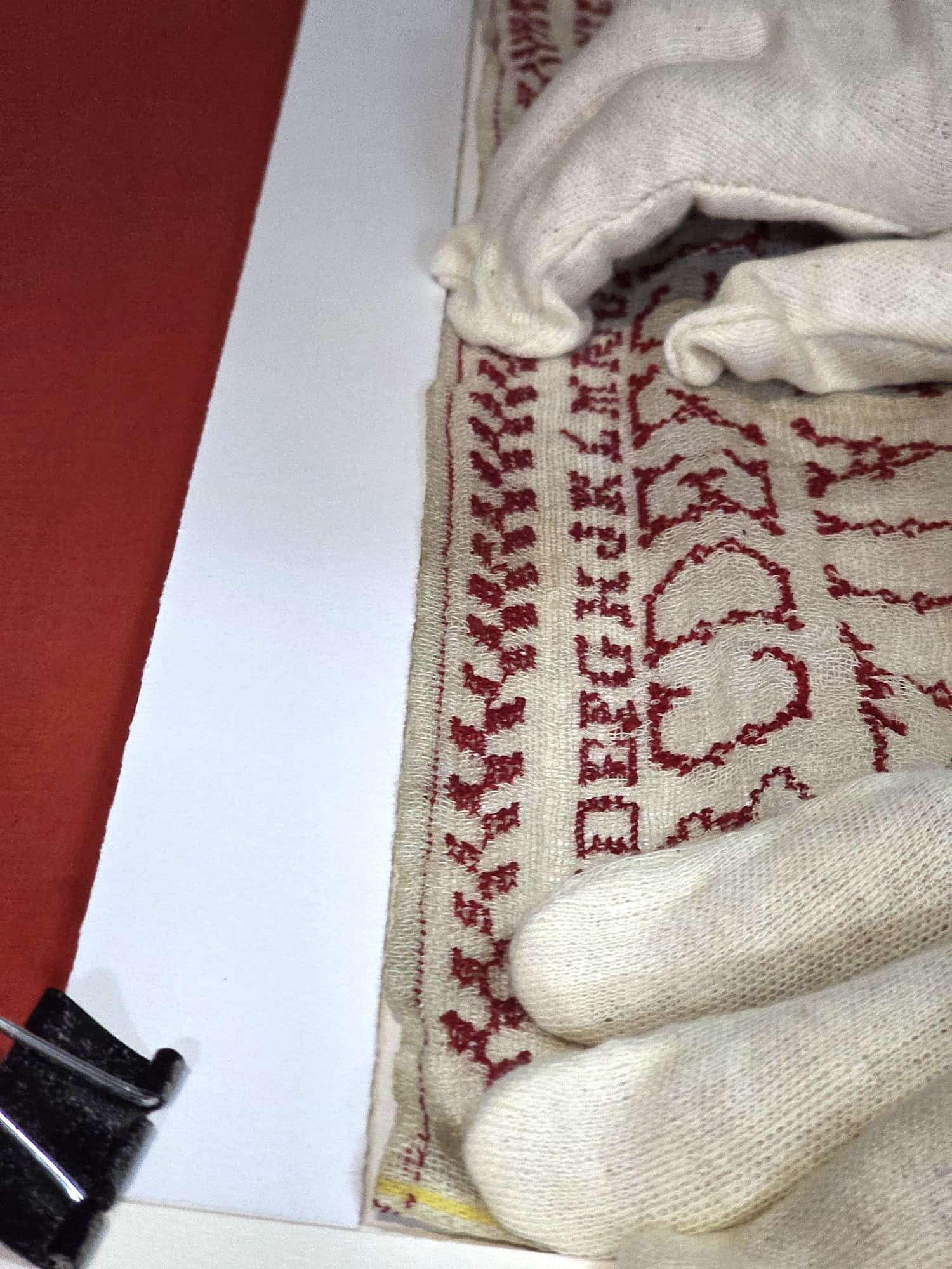 El nostre client ha escollit un marc tallat a mida i lacat de color grana. La intenció és que el color sigui igual que el dels fils del brodat.